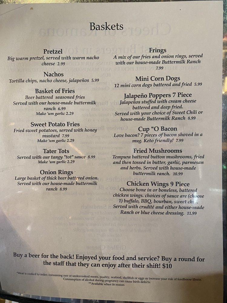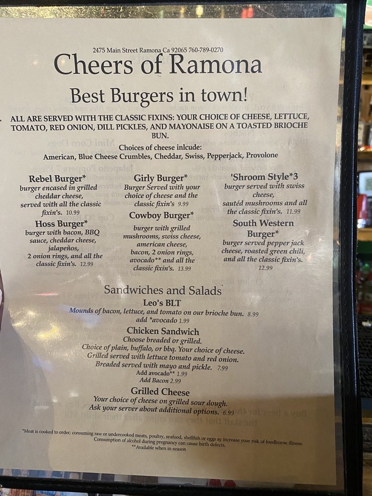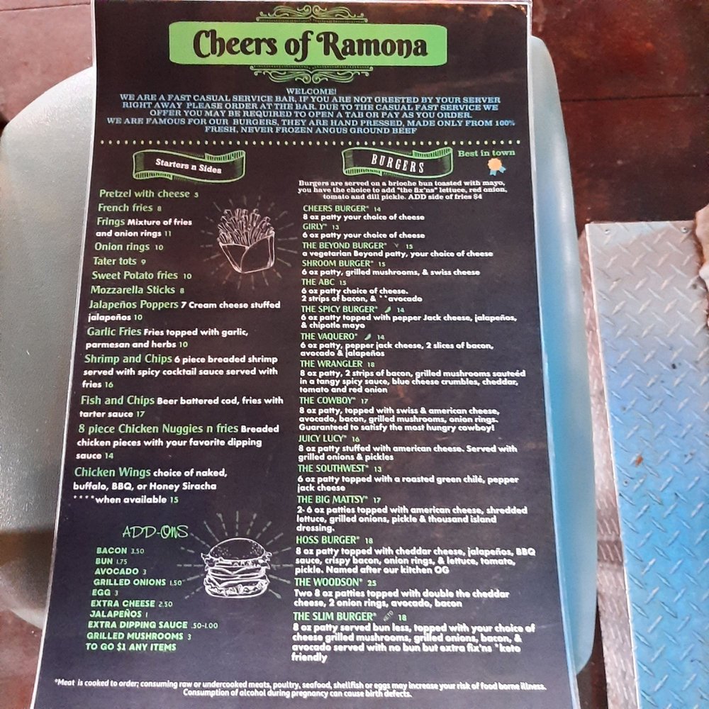 Introducing Cheers of Ramona, a dive bar located on the outskirts of Ramona, California. This hidden gem offers professional and polite staff, creating a warm and welcoming atmosphere. Known for serving some of the best burgers in the area, Cheers of Ramona also features an extensive menu with many vegetarian options. Guests can enjoy Guiness on tap, live music, pool tables, and outdoor seating. The bar is perfect for groups, with options for takeout, delivery, and catering. With a full bar and friendly service, Cheers of Ramona is a favorite spot for locals and visitors alike. Don't miss out on the Juicy Lucy burger, paired with cold beer and tater tots for a delicious experience at this must-visit spot in Ramona.